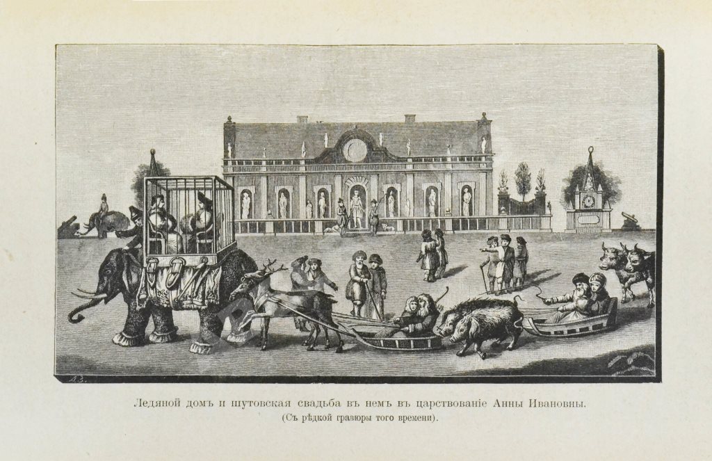Сама же Анна Иоанновна занималась делами куда более приятными и понятными ей. В 1733 году императрица Анна Иоанновна, переместившаяся из Курляндии прямиком на российский трон, оказала поддержку в борьбе за корону Польши Августу III. В благодарность за это Август признал новым герцогом Курляндии Эрнста Иоганна Бирона, фаворита императрицы. Бирон стал одной из самых влиятельных фигур в империи и одновременно одной из самых непопулярных. Ругательства с эпитетом «курляндская», прочно вошли в лексикон россиян и оставались в нем еще долго после того, как сам Бирон канул в Лету. Одной из причуд Анны Иоанновны было содержание при дворе шутов и шутих. Причем в шуты попасть мог абсолютно любой человек, оказавшийся вдруг в особой любви или же, наоборот, в немилости у царицы. На праздничные столы поставили два торта. Под музыку из них выскочили две карлицы и поздравили Анну с замужеством, после - станцевали менуэт! Гравюра 18 века Название романа адресует читателей к известной забаве императрицы - строительству дома изо льда и одной из своеобразнейших забав императрицы Анны Иоанновны, придуманной камергером А. Д. Татищевым в 1740 г. Вокруг Ледяного дворца разворачивается сюжет романа и разыгрывается потрясающе насыщенное действие, охватывающее несколько месяцев - с конца декабря 1739 по апрель 1740 года.