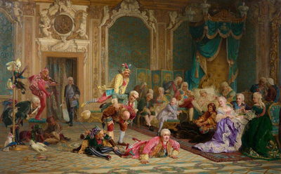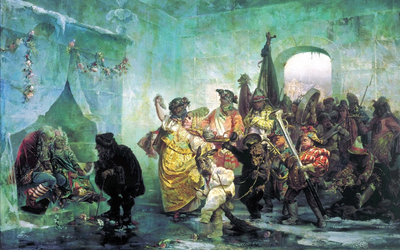 Валерий Иванович Якоби (1833-1902). "А.П. Волынский на заседании кабинета министров", 1875 г. Холст, масло. 45 x 68 см. Омский областной музей изобразительных искусств им. М.А. Врубеля. В ледяном дворце по велению Анны Иоанновны женили придворного шута (князя Голицына) и придворную шутиху (Буженинову). Сюжет включает исторически достоверные факты, сохраняя при этом черты поэтического вымысла. Судьба Михаила Алексеевича Голицына отражает все противоречия эпохи. Происходил из старшей, несчастливой ветви рода Голицыных («Васильевичи»). Приходился внуком Василию Голицыну, известному фавориту царевны Софьи. В 1689 году вместе с дедом и отцом был отправлен в ссылку, вначале в г. Каргополь, а позже в деревню Колмогоры (примерно в 200 верстах от г. Архангельска). Получил хорошее домашнее образование под руководством деда. После смерти деда Василия Голицына), семья была возвращена из ссылки. Впоследствии Михаил посылался Петром I за границу на обучение, слушал лекции в Сорбонне. После находился на военной службе, вышел в отставку в чине майора. В 1729 году, сразу после смерти своей первой супруги, Марфы Хвостовой, Михаил Голицын оставив в России двух детей, выехал за границу, где принял католичество и женился во второй раз на итальянке; по другим сведениям — на немецкой баронессе. Смене вероисповедания Михаил Алексеевич не придал значения, о чём вскоре горько пожалел.. В 1732 году, уже при императрице Анне Иоанновне, Голицыны с маленькой дочерью вернулись в Россию. Здесь они узнали, что государыня весьма строго относится к религиозным вопросам. Поэтому Голицын, тщательно скрывая от всех и иностранку-жену, и смену вероисповедания, тайно поселился в Москве, в Немецкой слободе. Но на него всё-таки донесли императрице. Государыня, узнав о вероотступничестве князя, в гневе отозвала Голицына в столицу. Его брак был признан незаконным. Жену Голицына отправили в ссылку (есть версия — выслали из страны), а самому ему велено было занять место среди придворных «дураков»-шутов. В 1732—1740 гг. — придворный шут, носивший с 1737 г. прозвище «Квасник». В его обязанности входило обносить императрицу и ее гостей русским квасом.