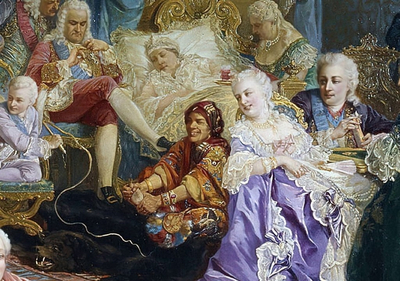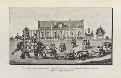 Лажечников Иван Иванович. Ледяной дом. Ч. 1-4.: в 4 ч. /Сочинения И.И. Лажечникова ; с рисунками П.И. Полякова ; издание и редакция Аркадия Сосницкого.- Москва. Тип. Э.Лисснера и Ю.Романа, 1894.- Ч. 1. - [4], 463, 118 с. Ч. 2. - 118 с. Ч. 3. - [4], 111 с. Ч. 4. - 118 с., 8 л. ил. 30 градусов мороза, вокруг — только лед. Уйти невозможно — возле спальни выставили стражу, которой запретили выпускать «молодых». Уцелеть у Голицына и Бужениновой не было ни единого шанса, тем не менее утром их обнаружили живыми, хотя и ужасно замерзшими. Ходят слухи, что спас пару тулуп, которой Авдотье удалось выменять у одного из караульных на жемчужное ожерелье, подаренное императрицей на свадьбу. В романа Лажечникова «Ледяной дом» есть достоверное описание и самой постройки, и ледяных статуй, и горящих фонтанов, и пестрой толпы в национальных костюмах, и национальные пляски. После опубликования романа А. П. Волынский прослыл почти национальным героем. Русский художник В. И. Якоби (1834-1902) на тему бироновщины пишет ряд картин - "Шуты при дворе императрицы Анны Иоанновны", "Волынский на заседании кабинета министров", "Свадьба в ледяном доме". В.И. Якоби. «Шуты при дворе императрицы Анны Иоанновны», 1872 год. Из собрания Третьяковской галереи На картине - спальня болеющей императрицы Анны Иоанновны. У изголовья ее кровати сидит Бирон. Придворных стараются развеселить шуты князь М.А. Голицын (стоит согнувшись) и князь Н.Ф. Волконский (вскочил на него), А.П. Апраксин (растянулся на полу), шут Балакирев (возвышается над всеми), Педрилло (со скрипкой) и д'Акоста (с бичом). У кровати - графиня Бирон. За столом играют в карты статс-дама Н.Ф. Лопухина, ее фаворит граф Левенвольде и герцогиня Гессен-Гомбургская. Позади них - граф Миних и князь Н. Трубецкой. Подле Бирона - его сын с бичом и начальник Тайной канцелярии А.И. Ушаков. Рядом сидят - Анна Леопольдовна, будущая правительница, французский посол де Шатарди и лейб-медик Лесток. На полу, возле постели - карлица-шутиха Буженинова. В стороне у насеста с попугаями - поэт В. К. Тредиаковский. В дверях ― кабинет-министр А. Волынский. Изображенное на картине время - 1740 г. В. Якоби. Фрагмент картины «Шуты при дворе императрицы Анны Иоанновны». В центре - Авдотья Буженинова. Через несколько месяцев после «дурацкой свадьбы» Анна Иоанновна умерла. Новая императрица Анна Леопольдовна распустила штат шутов и запретила в России «нечеловеческие поругания» над «дураками». Михаил Голицын снова оказался в удивительном положении. Он пережил позор, выжил после ледяной ночи, остался в здравом уме. После смерти Анны Иоанновны Голицын оказался на свободе, получил обратно свои титулы и часть имущества. С «шутовской» женой, ставшей любимой, он не расстался: увез ее с собой в имение, признал своей законной супругой перед Богом и людьми. Жила Буженинова как княгиня недолго: в 1742 году она умерла, рожая второго сына. Голицын снова женился. И снова стал отцом. Всего у него было четыре жены и множество детей. Некоторые его потомки стали известными государственными деятелями. Он дожил до 87 лет — в ту эпоху это было почти чудо. Современники говорят, что до последнего дня он сохранял здравый ум, ясную память и чувство юмора. Ледяной дом, построенный как каприз царской воли, представляется как отсылка к хрупкости и иллюзорности бездушной власти, построенной на страданиях других. Нам же на память о шутовском бр