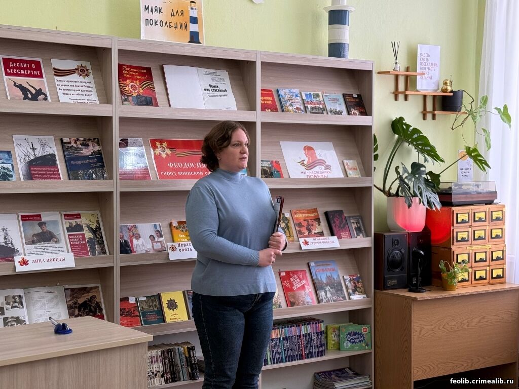 Цикл патриотических мероприятий ко Дню освобождения ФеодосииК 82-й годовщине освобождения Феодосии от немецко-фашистских захватчиков в Центральной детской библиотеке прошёл цикл патриотических мероприятий. Ведущий библиотекарь читального зала Екатерина Сергеевна Фамильнова представила книжную выставку «Феодосия — город воинской славы». Экспозиция включила книги о героизме защитников города, стойкости местных жителей, переживших оккупацию, а также исторические фотографии. Для детей младшего школьного возраста ведущий библиотекарь абонемента для учащихся 1–4 классов Галина Владимировна Горшкова и научный сотрудник картинной галереи имени И. К. Айвазовского Ольга Романовна Гутман провели школьников по «Страницам воинской славы Феодосии: их именами названы улицы города». Ребята узнали о героях - Н. Челнокове, Н. Старшинове, Н. Степаняне и других героях. Ольга Романовна показала портреты феодосийских подпольщиков и партизан, находящиеся в коллекции Картинной галереи имени И. К. Айвазовского. Автор портретов Лидии Прокопенко, Емельяна Колодяжного, Александра Куликовского и Ивана Мокроуса - художник, директор галереи Николай Степанович Барсамов. Ирина Александровна Зимина главный библиотекарь абонемента для учеников 5-9 классов, подготовила для старшеклассников час мужества «Слава победителям: страницы освобождения города воинской славы». Юным феодосийцам библиотекарь показала документальные кадры военной Феодосии, рассказали о героических усилиях, которые потребовались для освобождения города от фашистских захватчиков. Ведущая и молодые читатели обсудили, чем опасен фашизм. В заключение мероприятия ребята должны были собрать недостающие фрагменты снимков военных лет, чтобы почувствовать себя настоящими историками. Е. В. Степанова, руководитель Центральной детской библиотеки | |