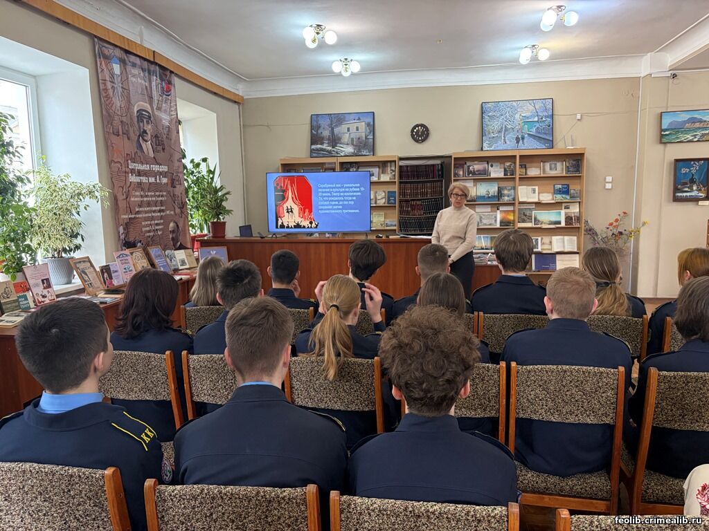 День библиографии «На театральных подмостках Феодосии Серебряного века»26 марта в Центральной городской библиотеке им. А. Грина прошел День библиографии «На театральных подмостках Феодосии Серебряного века», приуроченный к Всемирному дню театра и 150-летию Союза театральных деятелей Российской Федерации.Приглашенными гостями Дня библиографии стали девятиклассники кадетского класса школы № 3 им. Ю. А. Гарнаева, их классный руководитель - заместитель директора по УВР, учитель английского языка М. С. Османова и педагог-библиотекарь Е. В. Суета, с которыми у библиотеки установились дружеские отношения. Главный библиограф ЦГБ им. А. Грина Т. М. Гурьева рассказала учащимся об истории театра в уездном городе Феодосия на рубеже ХIХ и ХХ веков – самой «театральной» эпохе в истории русской культуры. В яркую мультимедийную презентацию, которая раскрыла многогранную театральную жизнь города в период уникального явления в культуре России – Серебряного века, вошли многие эпизоды того времени: посещение А. Чеховым Феодосии, выступления различных гастрольных трупп, посещение города знаменитыми артистами – Ф. Раневской, А. Вертинским, И. Кремер, М. Заньковецкой и другими не менее известными артистами, оставившими след в истории русского театра. Ребята услышали о том, как более ста лет назад в Феодосии недостаток профессиональных зрелищ до какой-то степени восполнялся любительскими спектаклями в залах мужской и женской гимназий, устраиваемыми с благотворительными целями. Ученики 9-К класса школы № 3 тоже участвуют в школьных театральных постановках. На мероприятии они узнали, что знаменитый поэт и художник Максимилиан Волошин, будучи гимназистом седьмого класса Мужской гимназии, отличился в роли городничего на концертной сцене Дворянского собрания в 1896 году. Дети увидели рисунок феодосийского графика, архитектора С. Арефьевой. На нём было изображено первое здание зимнего драматического театра в городе, возведённое между 1908 и 1911 годами. Рассказ ведущей включал также сведения о «Театре Иллюзий», о литературно-художественном обществе "Киммерика", о литературно-артистическом кружке «ФЛАК» времен Гражданской войны. Для иллюстраций, кроме фотографий, были использованы видеозаписи из фильма, снятого Свердловской киностудией по оперетте И. Кальмана "Сильва" в 1944 году, записи 1920-х годов Александра Вертинского "Над розовым морем" и Изы Кремер "Бубенцы". Главный библиограф рассказала, что в Феодосии еще до революции 1917 года существовал Союз сценических деятелей, о том, что к приходу большевиков единогласно директором и главным режиссером зимнего драматического театра, председателем Союза сценических деятелей был избран Анатолий Андреевич Сасс-Тисовский (впоследствии актер и режиссер Тульского театра драмы, заслуженный артист РСФСР), а также о профсоюзе работников искусства - РАБИС в Феодосии. К мероприятию Т. Гурьева подготовила информационно-библиографический указатель с одноименным названием Дня библиографии. В заключение библиограф познакомила ребят с фондовой выставкой о театре и артистах, которые выступали на театральных подмостках в конце ХIХ - начале ХХ века в Феодосии, и пожелала молодым актерам успехов на сцене школьного театра. Т. Гурьева, главный библиограф ЦГБ им. А. Грина | |