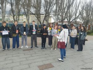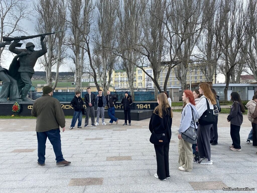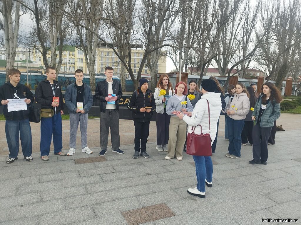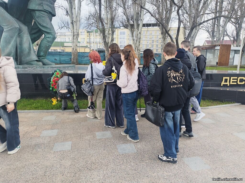 Литературно-исторический стоп-кадр "Это место, этот день"Ежегодно, 13 апреля Феодосия отмечает годовщину освобождения города от гитлеровских захватчиков. Феодосия помнит и чтит своих героев: именами освободителей названы улицы, благодарность за спасенную жизнь и живые цветы несут горожане к памятным местам сражений. Литературно-исторический стоп-кадр "Это место, этот день" перенес читателей Городской детской библиотеки им. А. Гайдара, студентов Политехнического техникума на набережную Десантников к памятнику "Феодосийскому десанту 1941 год" (установлен 7 мая 1994 года). О событиях тех лет рассказал преподаватель социально-правовых дисциплин Пожидаев Данил Юрьевич, а руководитель библиотеки Кепа С. В. познакомила ребят с книгами разных авторов о памятных днях Освобождения. Ведущий библиотекарь Журавкова Ж. М. представила ребятам сборник эссе на патриотические темы "Я горжусь - что я крымчанин" (Фонд Президентских грантов, Крымский республиканский союз ветеранов) и выразила надежду, что в следующем сборнике будут имена присутствующих ребят. Студенты возложили цветы к памятнику и почтили память павших героев в борьбе с немецко-фашистскими захватчиками минутой молчания. С. В. Кепа, руководитель библиотеки | |