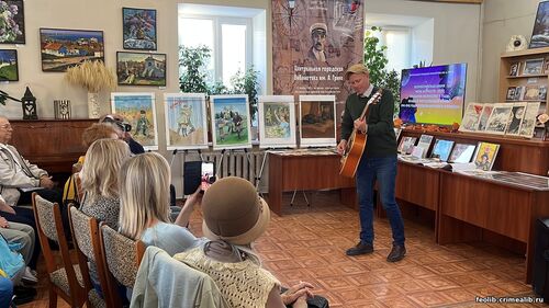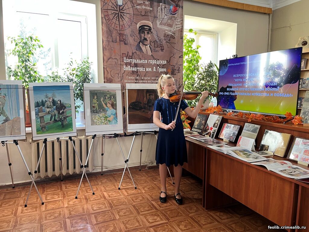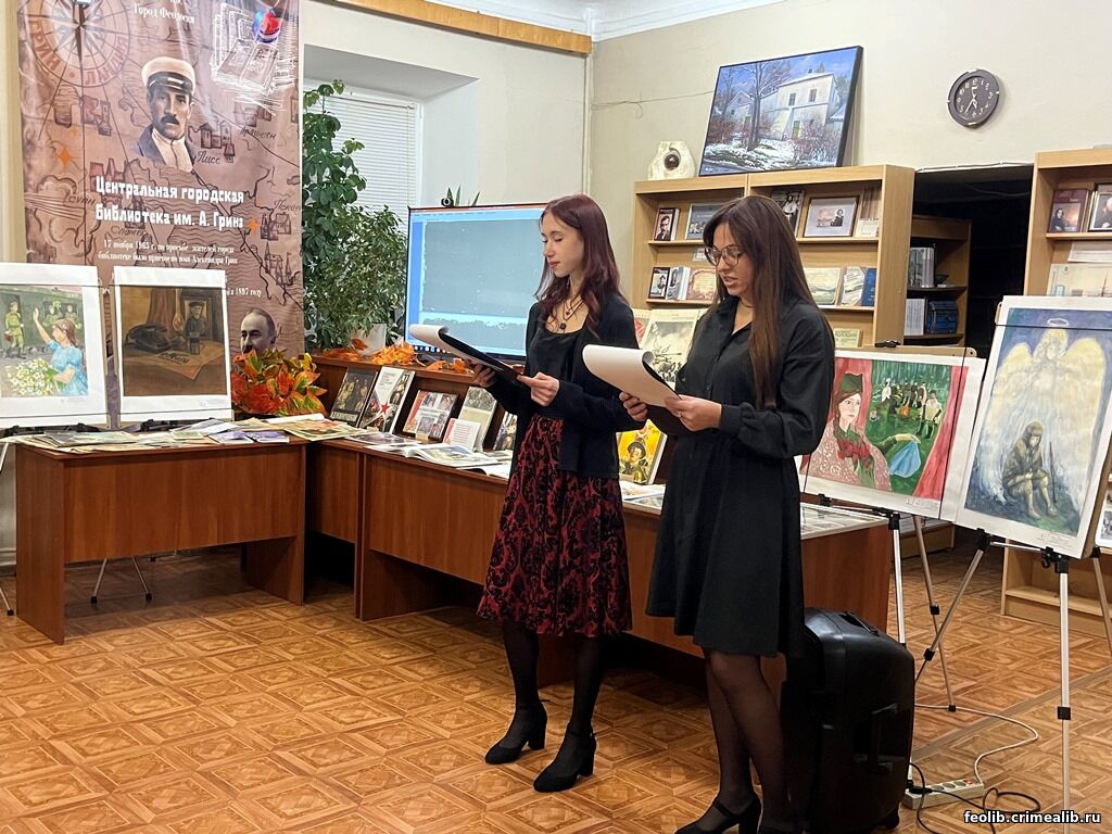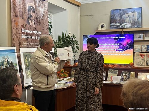 Всероссийская акция «Ночь искусств - 2025» «Искусство в годы Великой Отечественной войны 1941–1945 годов: образы мужества и победы»Центральная городская библиотека им. А. Грина присоединилась к ежегодной Всероссийской акции «Ночь искусств», приуроченной ко Дню народного единства и Году защитника Отечества.Акция проходила под девизом «В единстве культур — сила народа». Сотрудники библиотеки подготовили праздничную программу «Искусство в годы Великой Отечественной войны 1941–1945 годов: образы мужества и победы», которая создала неповторимую атмосферу в библиотеке и позволила погрузиться в художественный мир. Ведущие - библиотекари Кристина Юрьевна Ильина и Екатерина Александровна Ковальчук увлекли гостей рассказом о чарующем влиянии искусства, благодаря которому жизнь человека становится интереснее, торжественнее, веселее, значительнее. Е. А. Ковальчук представила гостям исторический экскурс «Политические плакаты Страны Советов», познакомив с уникальным отечественным художественным наследием, признанным высочайшим достижением мирового графического искусства. В советское время плакаты были одним из самых популярных средств массовой агитации. Через плакат художники воспитывали в людях чувство патриотизма, сплоченности и любви к своей стране. Особое значение пропагандистские плакаты приобрели во время Великой Отечественной войны. Советские плакаты военных лет наглядно показывали всю трагедию войны, ставя своей главной задачей укрепление веры советских людей в победу. В этом жанре работали такие художники, как Виктор Корецкий, Николай Жуков, Дмитрий Моор, Виктор Дени, Алексей Кокорекин, Виктор Иванов, группа художников «Кукрыниксы», группа художников «Окна ТАСС». Председатель Клуба коллекционеров г. Феодосии, член Общественного совета города Феодосии, вице-президент Федерации бокса г. Феодосии, лауреат Премии Ленинского комсомола и члена Совета Ветеранов Афганистана и других локальных войн Владимир Владимирович Дьяков рассказал о художниках - А. Р. Эберлинге, который изобразил портрет Ленина на купюрах образца 1937 года, главном художнике Госзнака (1932-1971) И. И. Дубасове, который разрабатывал денежные знаки, государственные награды и почтовые марки, Л. Ф.Майоровой и другими. В. Дьяков продемонстрировал деньги, которые находились в обороте в период Второй Мировой войны, а также коллекцию журналов «Огонек» за 1943 г. К. Ю. Ильина подготовила информационное досье «Война и победа в живописи и графике крымских художников». Живописцы, графики, скульпторы запечатлели волнующие картины массового героизма, горячий накал яростной борьбы советских воинов и партизан с врагом, горечь неудач и ликующее счастье побед. Посетителей познакомили с особенностями работ Н. С. Самокиша, Ю. В. Волкова, С. И. Владимирова, И. А. Пантелеева, Л. В. Лабенока, Г. Н. Куриленко, П. К. Столяренко, Н. Я. Бута , Н. П. Чуприна. Старший научный сотрудник Феодосийской картинной галереи имени И. К. Айвазовского Ольга Романовна Гутман рассказала о работе Феодосийской картинной галереи во время Великой Отечественной войны, о сохранении и подготовке сотрудниками галереи Айвазовского коллекции к эвакуации, о возвращении картин в Феодосию и восстановлении галереи после войны, о творчестве феодосийских художников. Более подробно остановилась на работах С. Барсамова -