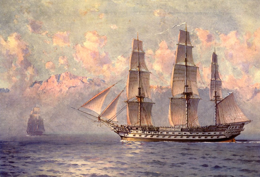 Алексей Ганзен. Линейный корабль «Императрица Мария» под парусами. Иллюстрация к альбому «Российский императорский флот» «Императрица Мария» — парусный линейный корабль Черноморского флота Российской империи, находившийся в составе флота с 1853 по 1855 год, один из двух кораблей типа «Храбрый», участник Крымской войны, в том числе Синопского сражения. В 1914–1915 гг. основным заказчиком картин Ганзена стало Морское министерство, в 1915 г. официально назначен художником Главного морского штаба России.
